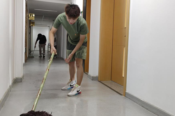 在进行简单的任务分配后,各小组在组长带领下对学院楼以及社区附近区域进行了认真清扫。活动中,同学们以积极能动的态度进行每一处角落的清理,晾晒抹布、拖地扫地、换水、擦围栏玻璃,不抱怨、不喊累,相互配合,以当代优秀大学生的标准要求自身,在劳动的同时也不忘讨论如何更好的打理并建设全新的学院环境。