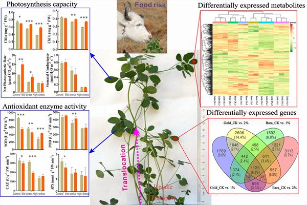 随着纳米材料在工、农、医等领域的广泛应用,其必然会通过各种途径进入环境,并进一步通过食物链在高营养水平生物中积累。当纳米粒子大量存在植物体内时,纳米材料对植物也具有毒性效应,影响植物幼苗的萌发,根系、叶片的生长以及作物的生物产量。该研究结合代谢组学与转录组学的数据特点,分析了不同抗性紫花苜蓿品种对高浓度石墨烯胁迫的响应机制。结果表明,中度和重度石墨烯胁迫(10和20 g kg-1)对叶片氮代谢、抗氧化防御系统和光合作用过程有显著的干扰。不同抗性紫花苜蓿品种叶片进行超高效液相色谱-质谱(UPLC-ESI-MS/MS)分析,共确定了406种响应石墨烯胁迫的代谢物,其中金皇后在中度和重度胁迫中分别发现62种(26 种上调,36 种下调)和110种(49 种上调,61 种下调)差异代谢物,Bara 310SC分别鉴定出13种(8 种上调,5 种下调)和58种(30 种上调,28 种下调)差异代谢物。转录组数据结果显示共产生250003个FLNC和65241个非冗余转录本。金皇后和Bara 310SC叶片在中度胁迫下分别得到7583和6163个DEGs,在重度胁迫处理下分别得到9136和9254个DEGs,且两个品种在中度和重度胁迫下共同表达1125个 DEGs。代谢组学和转录组学结果表明差异表达代谢物和差异表达基因的数量与石墨烯胁迫程度呈正相关。
