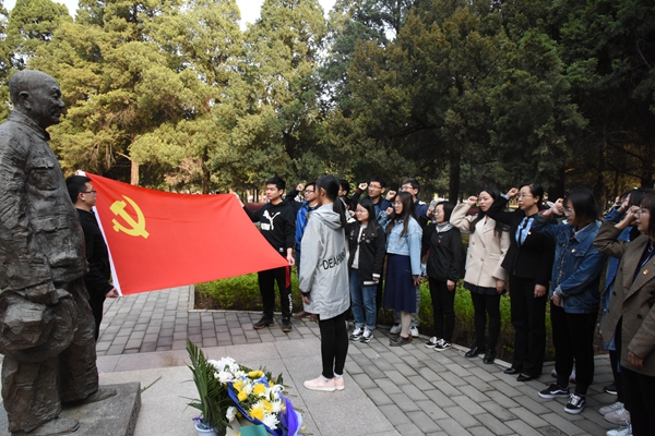 缅怀活动结束后,在先贤塑像前开展学生党员“亮身份·践承诺·树形象”主题实践活动强化教育,党总支书记苏蓉为新发展党员佩戴党徽,学生党员在先贤前辈塑像前做出带头示范、服务师生、履行责任的郑重承诺,全体党员重温入党誓词。