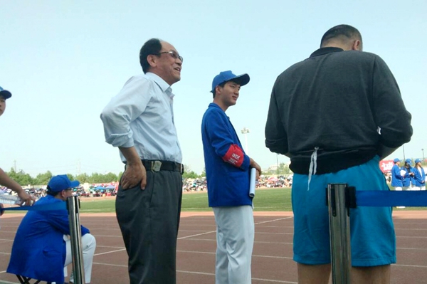 院长呼天明和党总支副书记兼副院长阮鹏为运动员加油