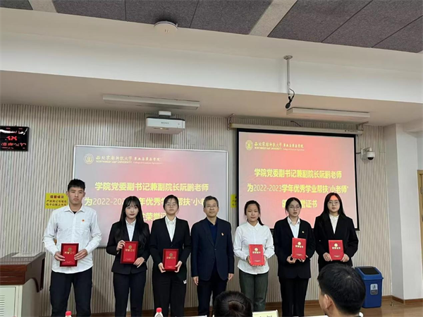 在颁奖暨聘任仪式上,学院党委副书记兼副院长阮鹏老师为2022-2023学年优秀学业帮扶“小老师”颁发荣誉证书并合影留念。