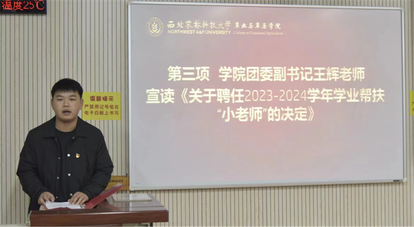 学院团委副书记王辉老师宣读《关于聘任2023-2024学年学业帮扶“小老师”的决定》。
