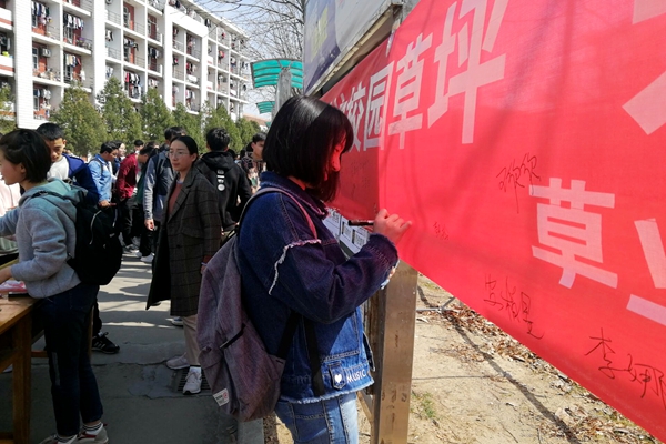 活动前期,我院学生会成员紧张策划,积极动员,学院学子响应热烈,为活动的顺利开展打下了坚实的基础。3月11日中午,我院学生会在北校区西区雕塑张挂以保护草坪为主题的横幅并邀请我校学子签名明志。活动期间,由学生会成员结合本院专业知识进行宣讲,主要为在场人员讲解草坪建植和维护的不易以及被踩过的草坪很难恢复的现状,以此来号召大家不要因为节省时间或缩短路程而随意践踏草坪,宣讲过程中,有不少同学深受感触,前来填写有关校园草坪现状及维护情况的调查问卷,并自愿在横幅上签名以示保护校园草坪之志。